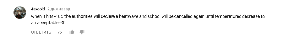 «-Когда мороз отступит до -10C, власти объявят тепловую волну, и школа будет снова отменена, пока температура не снизится до приемлемого -30;