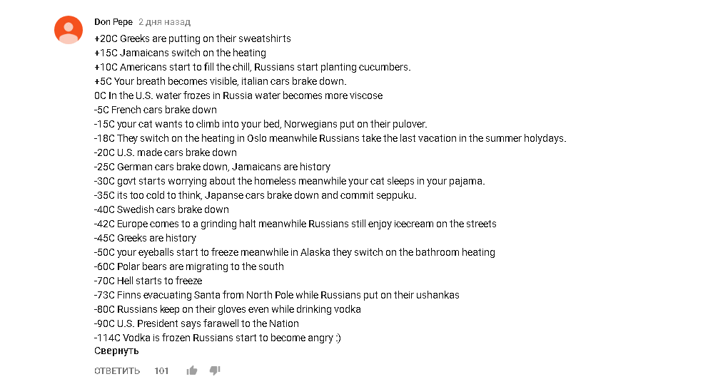 А наиболее осведомленный западный пользователь привел некую шкалу действий-реакция жителей планеты Земля на понижение температуры с градацией по странам и национальностям.