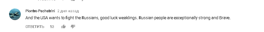 «А США хотят бороться с русскими, удачи этим слабакам. Русский народ исключительно силен и храбр.»- предупредил некто неугомонных американцев.
