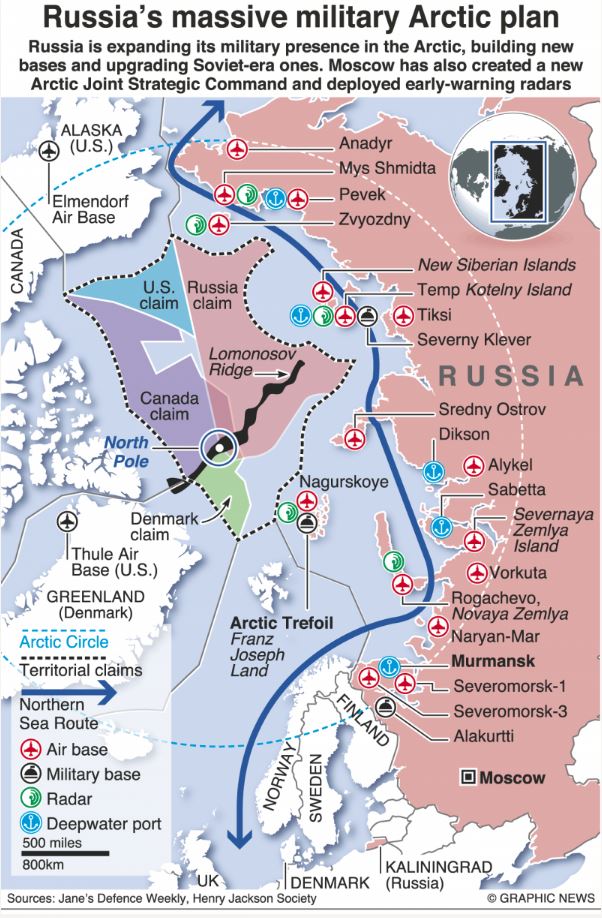 Агентство «Рейтер» пишет, что Москва вбухала огромные ресурсы в свою «северную оборону». Денег туда ушло столько, сколько не тратилось на тот регион «в любой момент после падения Берлинской стены». В иных направлениях Москва теперь имеет «ещё больше возможностей и достижений в регионе, чем до 1989 года». Речь идёт о создании или возобновлении деятельности шести военных форпостов и строительстве трёх новых крупных атомных ледоколов. Эти суда пополнят и без того крупный ледокольный флот страны.