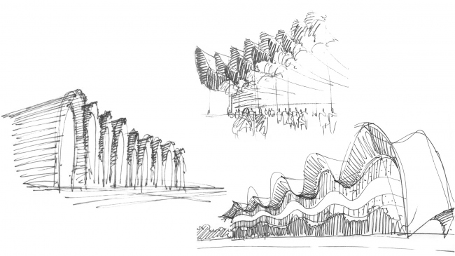 По словам архитекторов, выразительный образ, связанный со стремительным движением, возник сразу же. Но одно дело – очертить образ росчерком пера, и совсем другое – довести замысел, связанный со смелой криволинейной формой, до реализации, причем в достаточно короткие сроки.