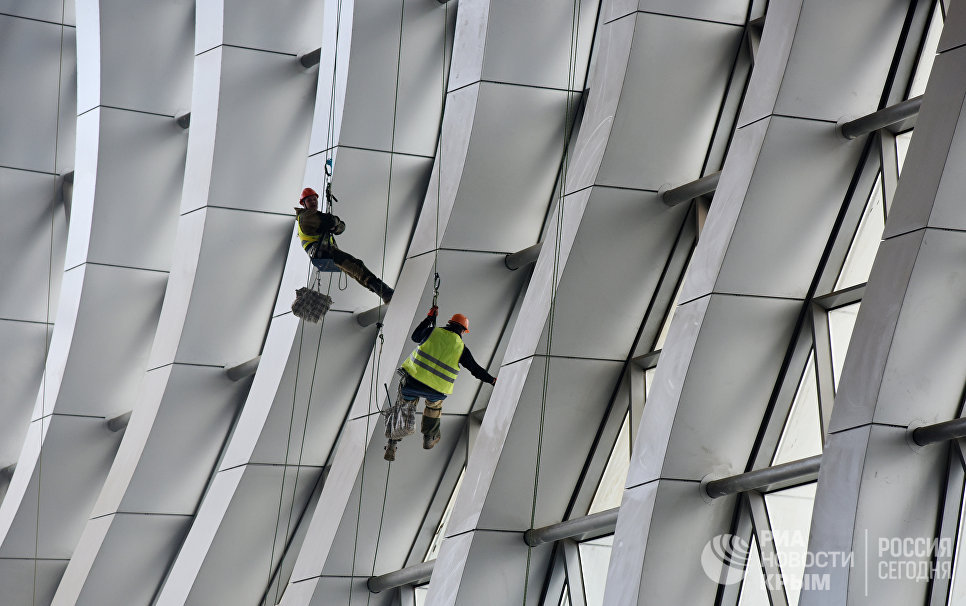 «Фасады здания формируют 136 криволинейных колонн, каждая имеет уникальный радиус кривизны, то есть она не повторяется, — поясняет он. — Наверное, подобные неповторяющиеся элементы здания исчисляются десятками тысяч. К примеру, для остекления использовались 9 тыс стеклопакетов. Чтобы их закрепить, были индивидуально выточены 6 тыс узловых деталей — строители, по сути, паззл, мозаику складывали. Кровля здания также криволинейная, с переменной высотой от 25 до 35 м. И ребра, видимые на фасаде, также выложены и на крыше в виде декоративных элементов. Эту криволинейную, волнообразную, форму смогут из иллюминаторов видеть пассажиры авиасудов, подлетающих к аэродрому».