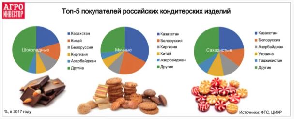 Многие годы основными покупателями сладостей российского производства остаются страны ближнего зарубежья: в первую очередь это Казахстан, Белоруссия, Азербайджан и государства Центральной Азии. С 2016-го российские компании активно осваивают и новые направления, из которых наиболее высокие результаты показали китайский и монгольский рынки. В прошлом году Китай вновь был вторым по величине покупателем российских шоколадных кондитерских изделий, но снизил позиции в Топ-5 основных покупателей мучных сладостей с третьего места на четвертое. В 2017-м на страну приходилось 12,5% из общих поставок российского шоколада на экспорт и 6,7% — мучных кондитерских изделий.