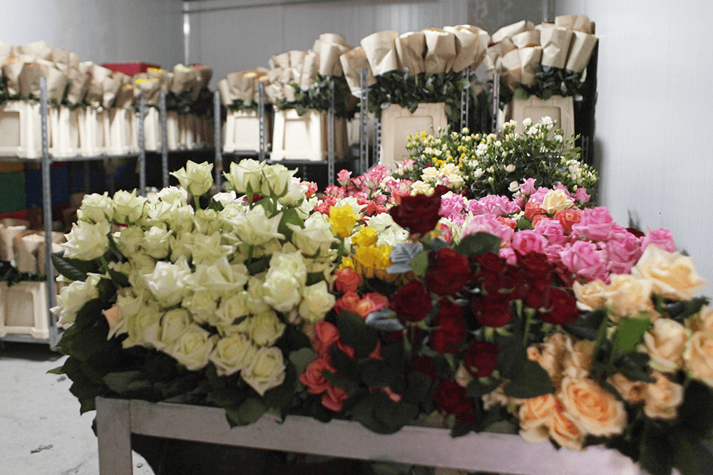 Ну, а срезанные с еще «кондиционных» кустов розы в теплице собирают в «пучки» — в каждом по двадцать цветков-близнецов одного сорта и высоты. В ожидании отправки букеты могут «заскучать» и потерять потребительские свойства. Чтобы исключить это, розы хранят в огромном холодильнике. При температуре плюс пять градусов они могут стоять хоть месяц. Но чаще цветы отправляют на реализацию в первый же день.