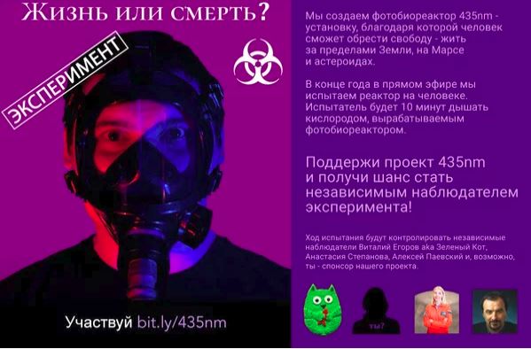 «435nm — это фотобиореактор, который позволит человеку дышать там, где нет кислорода: на других планетах, на межпланетных станциях, в бункерах и любом другом месте, где он оказался без воздуха. Собрав 400 000 рублей, я доработаю и протестирую 435nm на себе. В прямом эфире Youtube-канала сообщества «Твой сектор космоса» при независимых наблюдателях я надену дыхательную маску, которая изолирует мои легкие от атмосферы. Кислород для моего дыхания будет вырабатывать фотобиореактор. Я не буду снимать маску в течение 10 минут — через 3 минуты у меня кончится запас кислорода и мозг начнет медленно умирать. Но это в теории. На практике я уверен, что сразу начну дышать. Потому что верю в наше изобретение!», — написал на своей странице в социальной сети Вконтакте Шаенко.