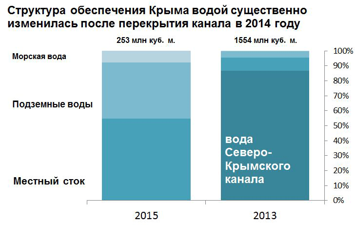 Существенно изменились объемы забора воды и структура ее источников. По всему Крыму были прорублены скважины, за счет чего удалось на 39% повысить забор артезианской воды. В разы увеличилось использование опресненной воды из моря. Большее внимание стало уделяться наполнению и поддержанию уровня воды в крымских водохранилищах.