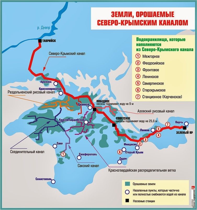 Серьезный вред Крыму Украина нанесла, перекрыв Северо-Крымский канал, по которому полуостров получал из Днепра до 85% воды. Больше всего пострадали север и восток Крыма, где из-за нехватки воды вырос уровень ее минерализации и жесткости. В некоторых районах вода и вовсе была признана непригодной для питья, например в Красноперекопском и Первомайском районах.