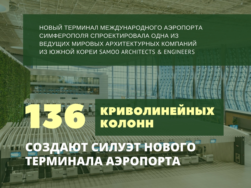 Новый терминал международного аэропорта Симферополя спроектировала одна из ведущих мировых архитектурных компаний Samoo Architects & Engineers (Южная Корея). Вдохновленные природой крымского полуострова, в качестве основной идеи дизайнеры взяли образ моря, назвав проект «Крымская волна».