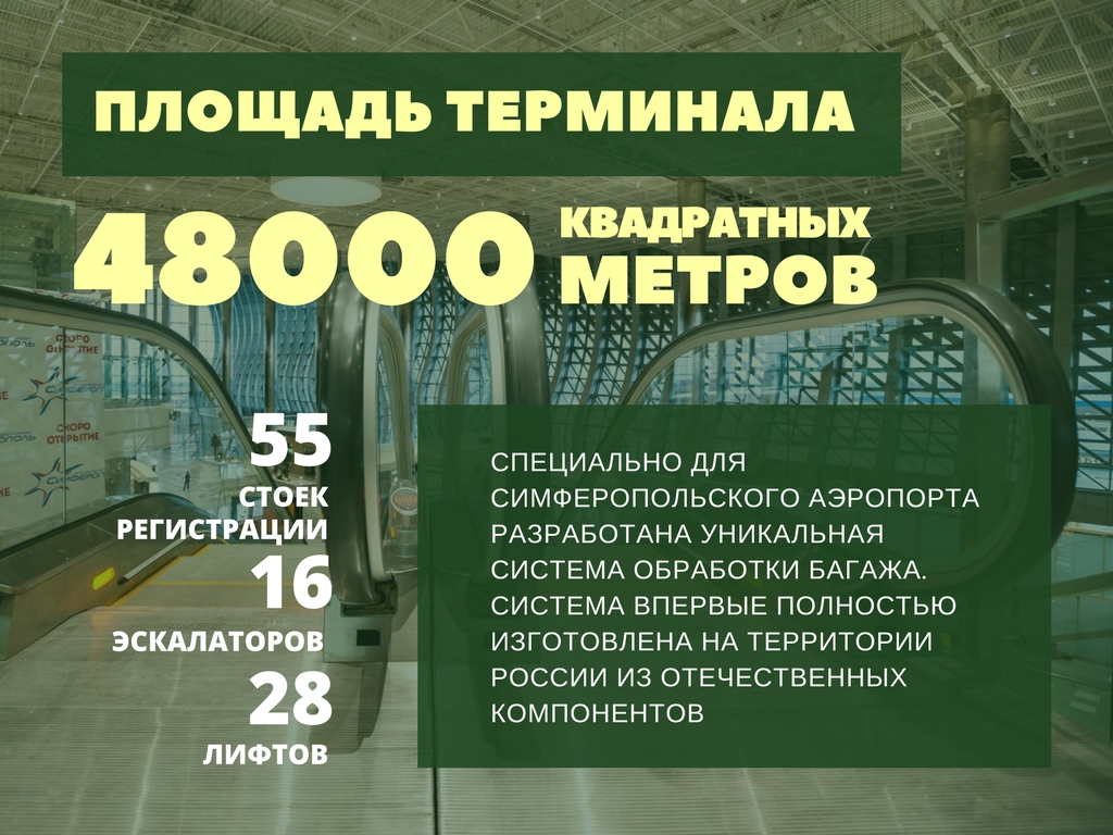 За федеральные средства к новому терминалу подвели коммуникации, возводят перрон для стоянки самолётов и рулёжные дорожки. В ближайшее время также построят новый командно-диспетчерский пункт, очистные сооружения, аварийно-спасательную станцию, ограждение по периметру с современными системами безопасности. Уже в этом году за средства ФЦП начнётся реконструкция второй взлётно-посадочной полосы, которая сможет принимать практически любые воздушные суда вплоть до крупнейшего в мире двухмоторного самолёта Boeing-777-300ER. Современное радиомаячное и светосигнальное оборудование взлетно-посадочной полосы сделает симферопольский аэропорт всепогодным.
