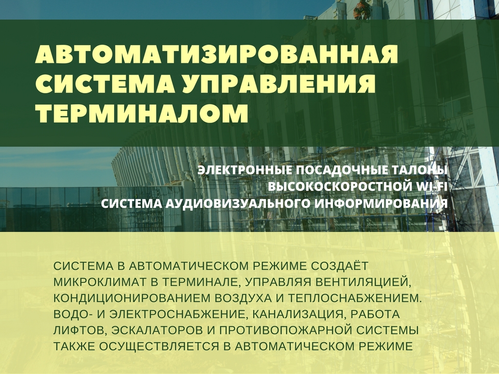 Все системы жизнеобеспечения терминала подключены к автоматизированной системе управления зданием. Она позволяет дистанционно контролировать и управлять инженерным оборудованием из единого диспетчерского центра. Система в автоматическом режиме создаёт микроклимат в терминале, управляя вентиляцией, кондиционированием воздуха и теплоснабжением. Водо- и электроснабжение, канализация, работа лифтов, эскалаторов и противопожарной системы также осуществляется в автоматическом режиме.