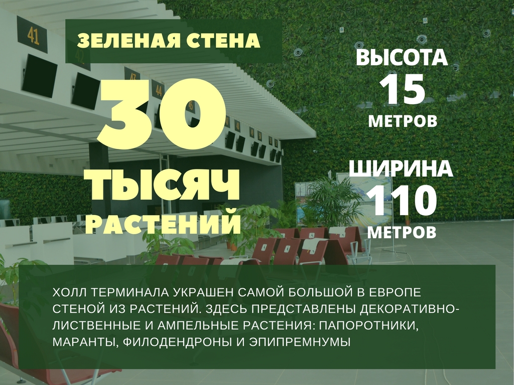 Большое внимание при строительстве аэровокзального комплекса уделено озеленению. Холл терминала украсила самая большая в Европе стена из растений площадью около 1,6 тысячи квадратных метров. «Зелёная стена» состоит из живой и искусственной частей: высота первой – 5 метров, второй – в два раза больше. Конструкцию высотой 15 метров и шириной 110 метров украсили декоративно-лиственные и ампельные растения: папоротники, маранты, филодендроны и эпипремнумы.