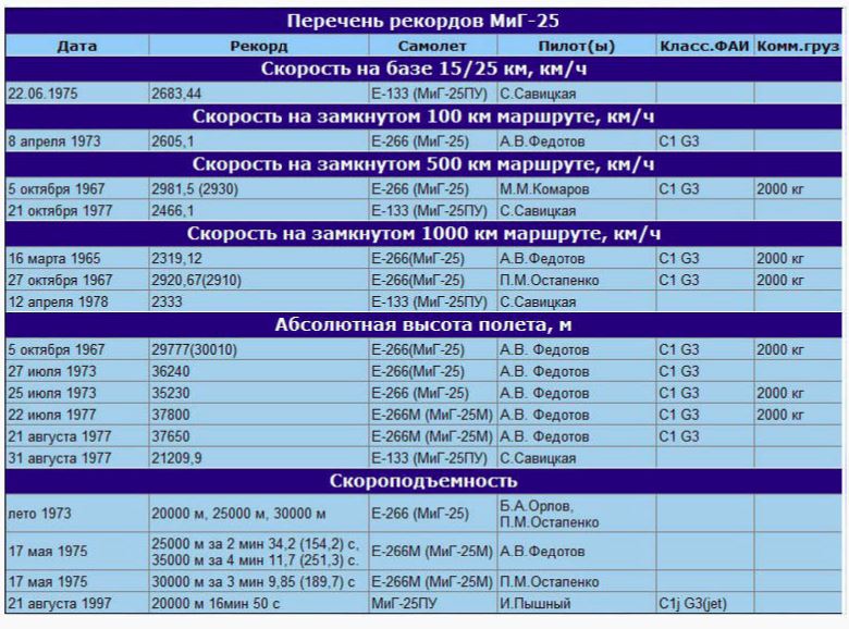 Рекорд высоты, был установлен МИГом, 22 июля 1977 года. Потолок полета в тот день, уперся в 37800 метров. А общий перечень рекордов, выглядел следующим образом: