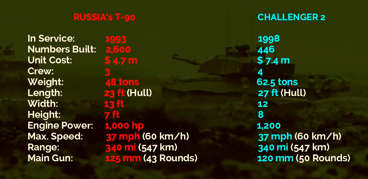 2. Броня российского Т-90 существенно легче, нежели у английского. (Это обуславливается тем, что Т-90 является танком прорыва, в то время как танки НАТО строились по концепции тяжелых оборонительных систем). Однако недостаток толщины брони Т-90 компенсирует динамической и прочими видами активной защиты, а также лучшей маневренностью на поле боя.