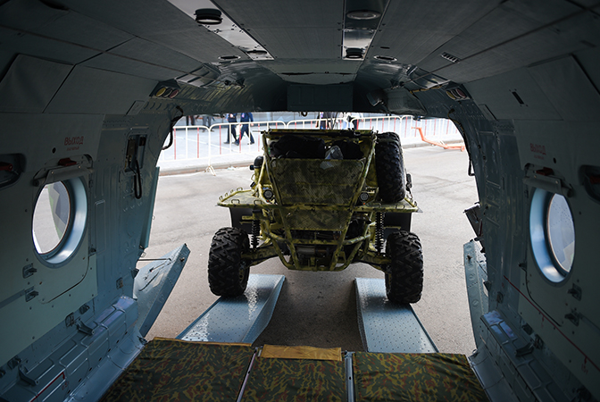 Опыт боевых действий в Сирии оказал большое положительное влияние на разработку Ми-171Ш. Конструкторы постарались учесть максимум пожеланий наших бойцов. В том числе и использование различной спецтехники. На фотографии представлен вездеход типа багги «Чаборз», разработанный в Чеченской Республике для бойцов спецназа.