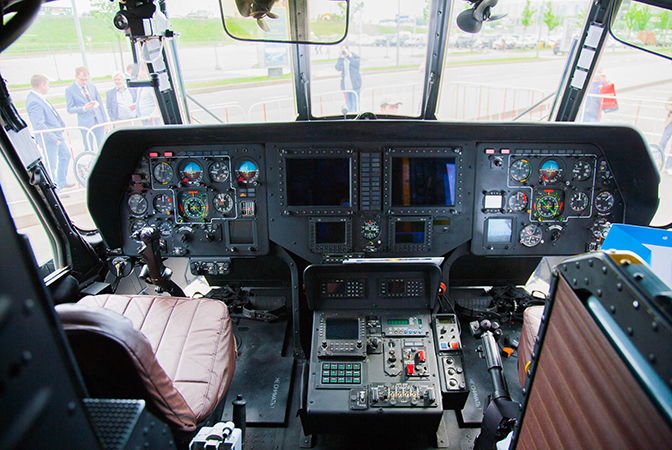 Приборная панель смешанная. На ней присутствуют современные многофункциональные индикаторы и привычные аналоговые приборы. То, что кабина не полностью «стеклянная», связано с требованиями по надежности эксплуатации вертолета в экстремальных боевых условиях, в том числе при низких температурах. Арматура кабины удобная, а сама она создает ощущение комфорта.