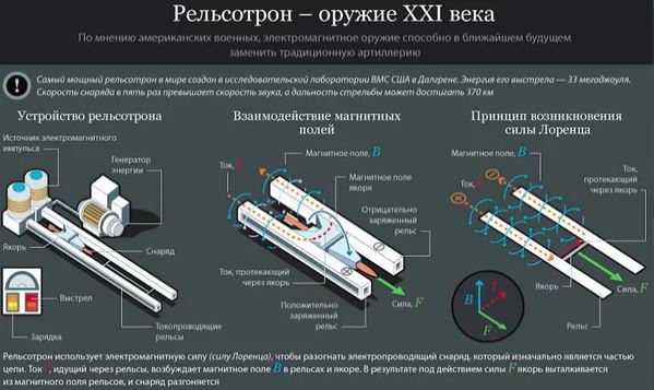 Проект данного оружия находится в разработке сразу нескольких стран. В частности, притязания на создание рельсотрона существуют у США, Великобритании, Китая и России. Это оружие будущего, которое позволяет поражать цели за счет кинетической энергии, выпущенного с огромной скоростью снаряда. ЭМИ-артиллерия России представляет собой электромагнитный ускоритель, позволяющий разогнать снаряд вдоль двух направляющих с помощью силы Ампера. Разработкой занимается прославленный российский физик Владимир Фортов совместно с сотрудниками ОИВТ РАН. Прошедшие не так давно испытания российского рельсотрона показали, что выпущенный снаряд смог развить скорость 3 километра в секунду.