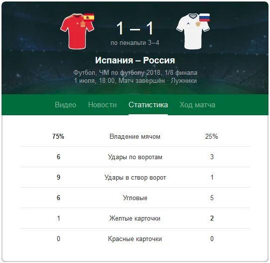 Испанцы держали мяч 120 минут, но так и не забили. Испанцы сделали 9 ударов в створ ворот, Россия – всего один. Угловые, личное мастерство, классы соперников, опыт — все было не в нашу пользу, но победили именно мы.