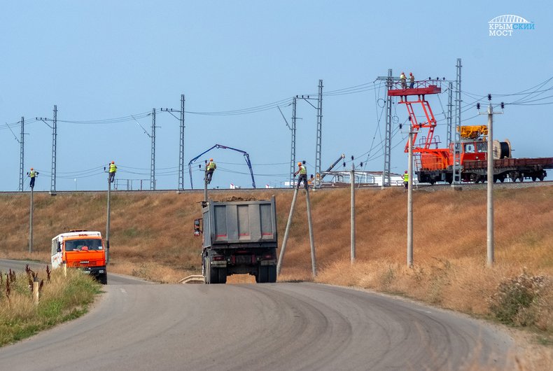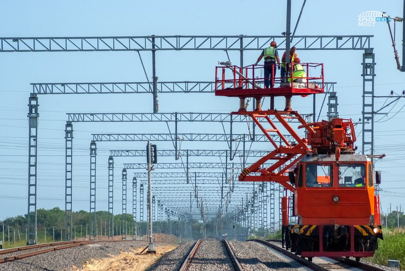 Готово более 80 % верхнего строения пути железной дороги, которая соединит Крымский мост с транспортной системой материковой России через станцию Вышестеблиевская. Двухпутный подход со стороны Таманского полуострова формируется из шпально-рельсовых плетей заводского производства длиной до 800 м. Они укладываются в линию на подготовленную упругую поверхность (балластный слой из песка и щебня) и соединяются между собой.