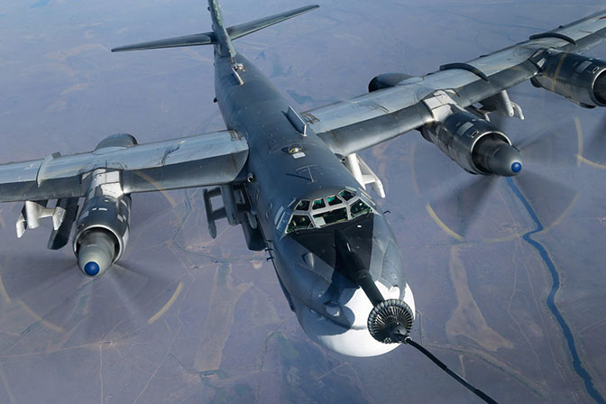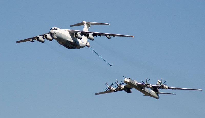 Во время полета Ту-95 «садится на хвост» самолету-заправщику, который выпускает шланг со специальным «конусом-юбкой».