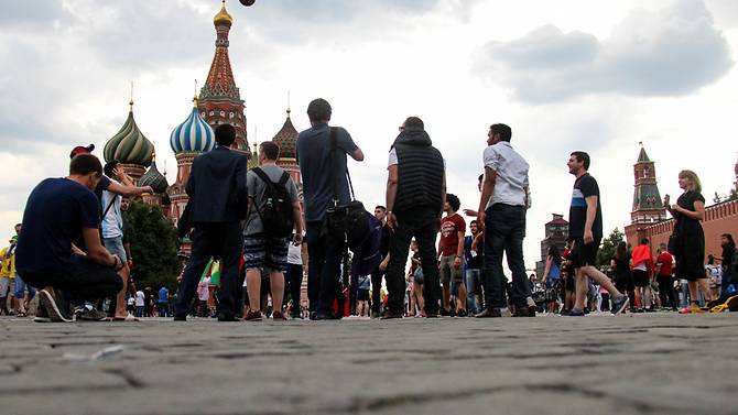 19 июня, я на Красной площади в Москве. Тысячи фанатов фотографируются с флагами и шарфами. Неподалеку от Храма Василия Блаженного собирается многонациональная команда по игре в «Чеканку»(набивание мяча без помощи рук), народ все прибывает, а игроки демонстрируют чудеса ловкости.
