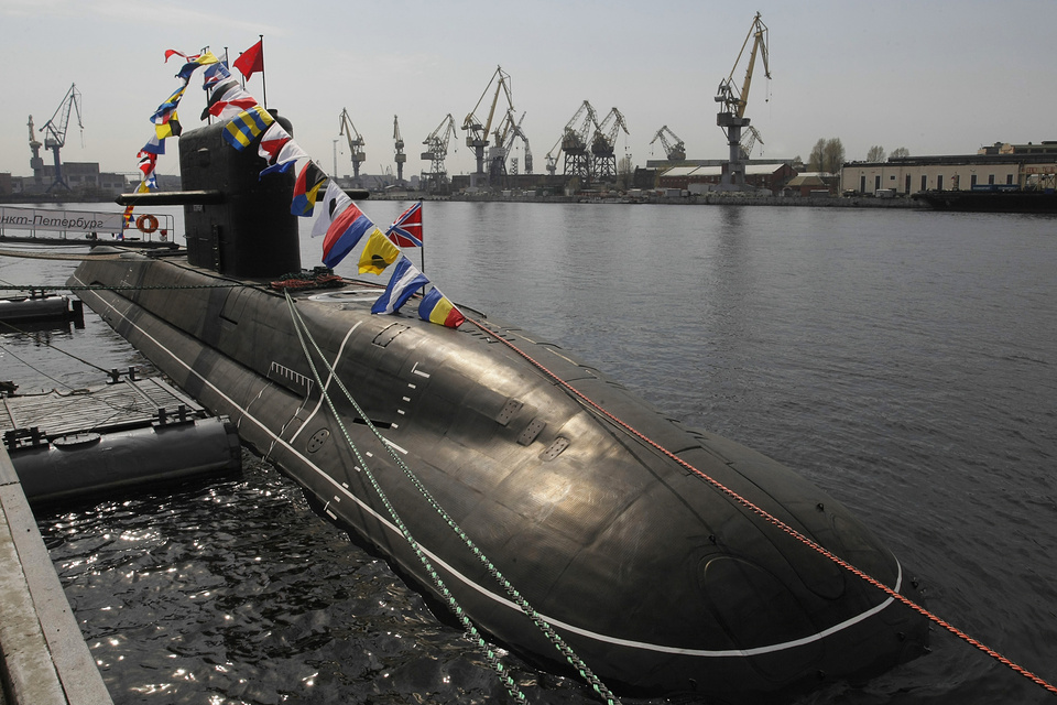 ITAR-TASS 110: ST. PETERSBURG, RUSSIA. MAY 8, 2010. The new, fourth postwar generation Project 677 Lada class diesel-electric submarine, designated Sankt Peterburg, is turned over to the Russian Navy during a ceremony at the Admiralty Shipyard in St Petersburg. (Photo ITAR-TASS / Vadim Zhernov)