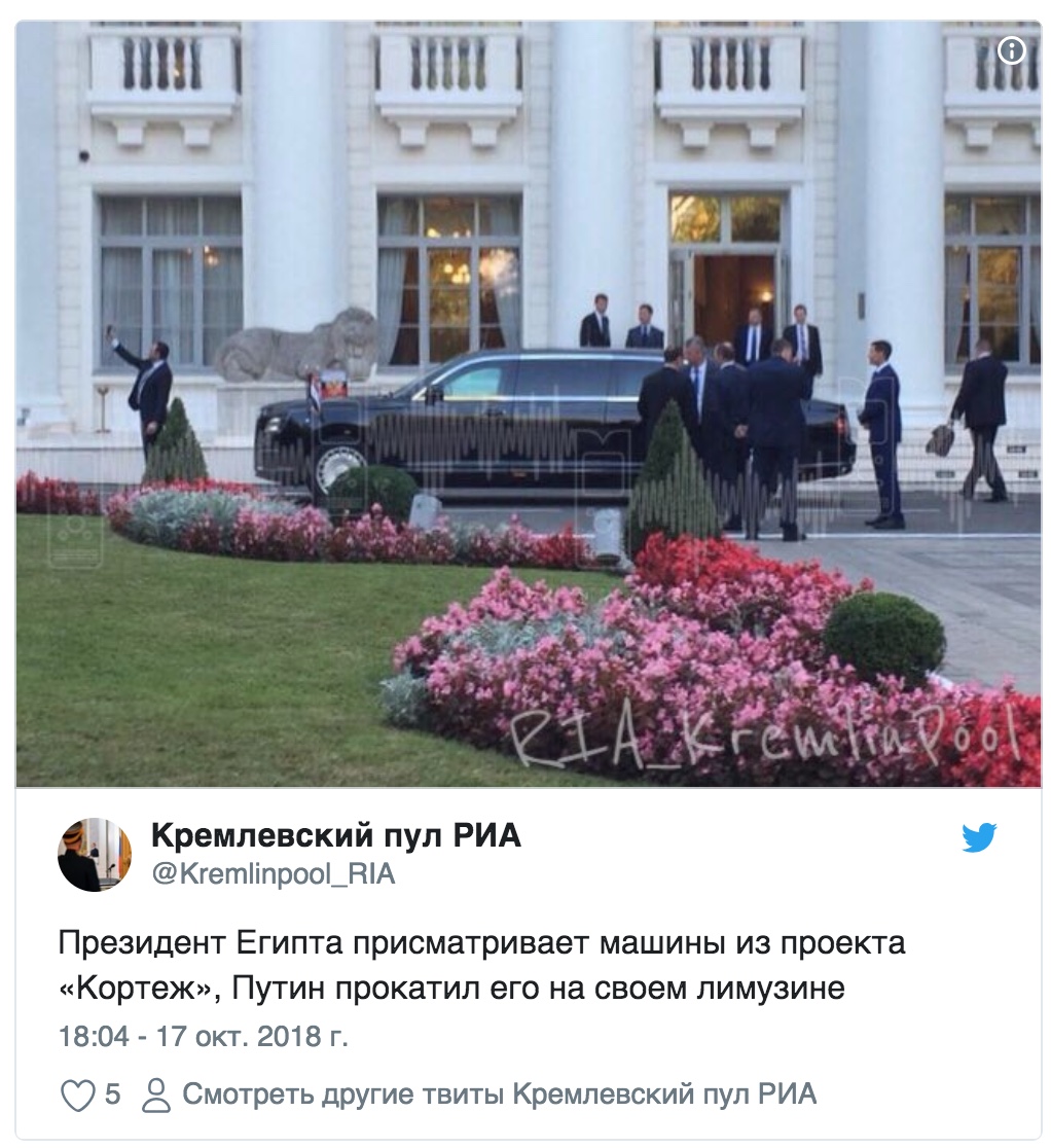 После осмотра Путин предложил Ас-Сиси опробовать седан на ходу, и президенты совершили поездку по трассе.