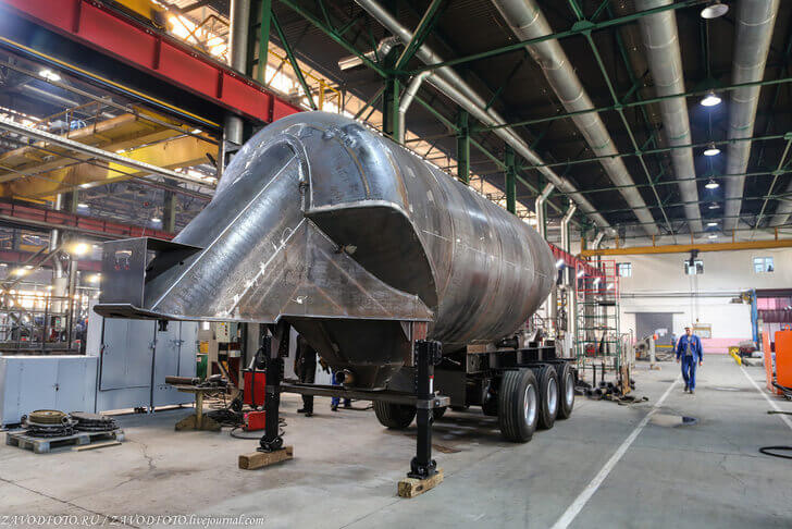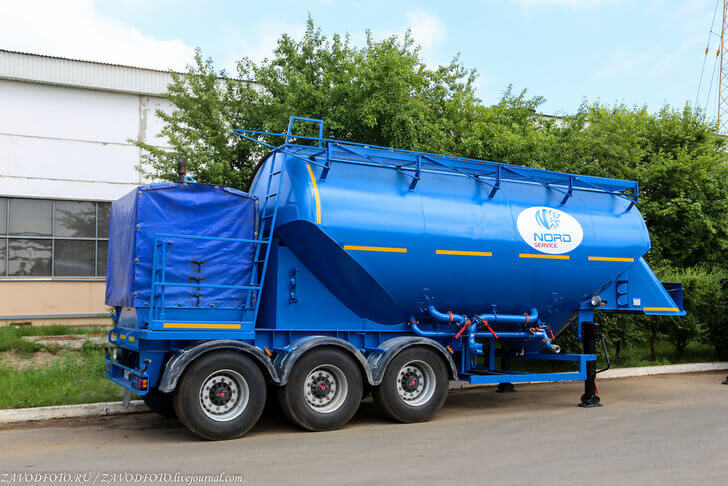 Как я уже сказал выше, цементная тема у них одна из главных. В качестве перевозчика цемента на данный момент завод предлагает своим клиентам две основные модели цементовозов: автоцементовоз «АЦТ-17» на базе шасси КАМАЗ (6×6) грузоподъемностью 17 тонн, и полуприцеп специальный «ЦТ-25» грузоподъемностью 30 тонн.