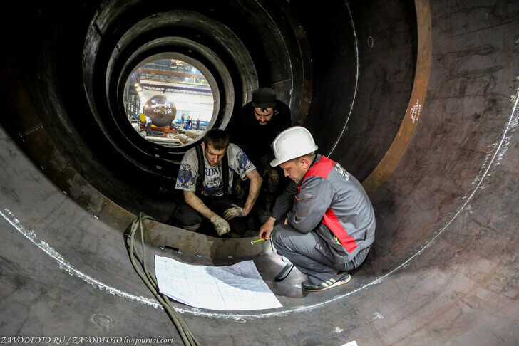 На следующем этапе эстафету подхватывает сварочное производство. Их технологии и оснащение позволяет творить, как при помощи полуавтоматической сварки в среде защитных газов, так и с помощью автоматической сварки под флюсом. Всё это позволяет изготавливать высококачественное оборудование за разумные сроки.