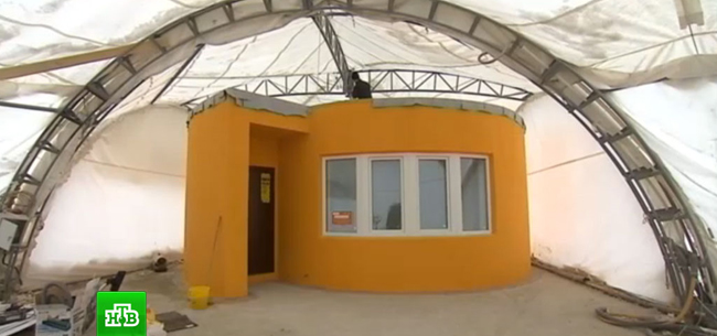 Раствор при этом подается автоматически. Он без участия строителей замешивается в специальной емкости. Чтобы масса не замерзла, стройку, то есть печать, накрывают шатром. 20 часов — и коробка дома в 38 квадратов жилплощади готова.