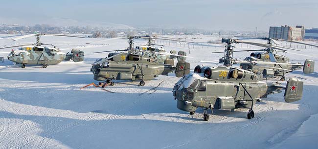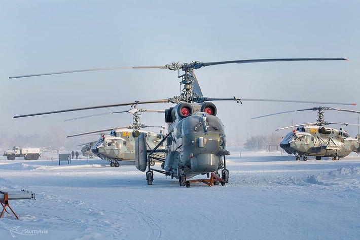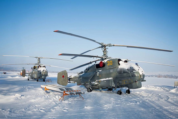 Прошедшие ремонт и модернизацию на на АО «Кумертауское авиационное производственное предприятие» противолодочные вертолеты Ка-27М транспортно-боевые вертолеты Ка-29 Морской авиации ВМФ России. Кумертау, предположительно декабрь 2016 года