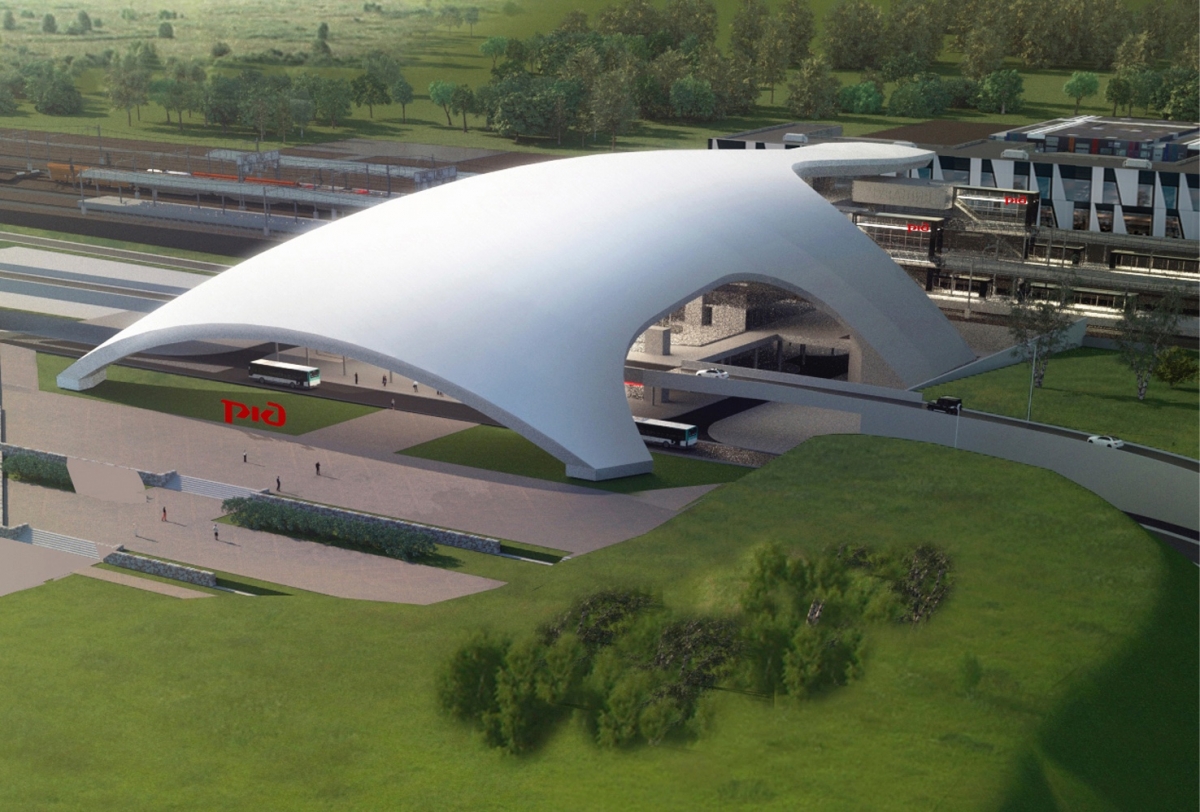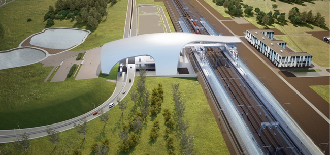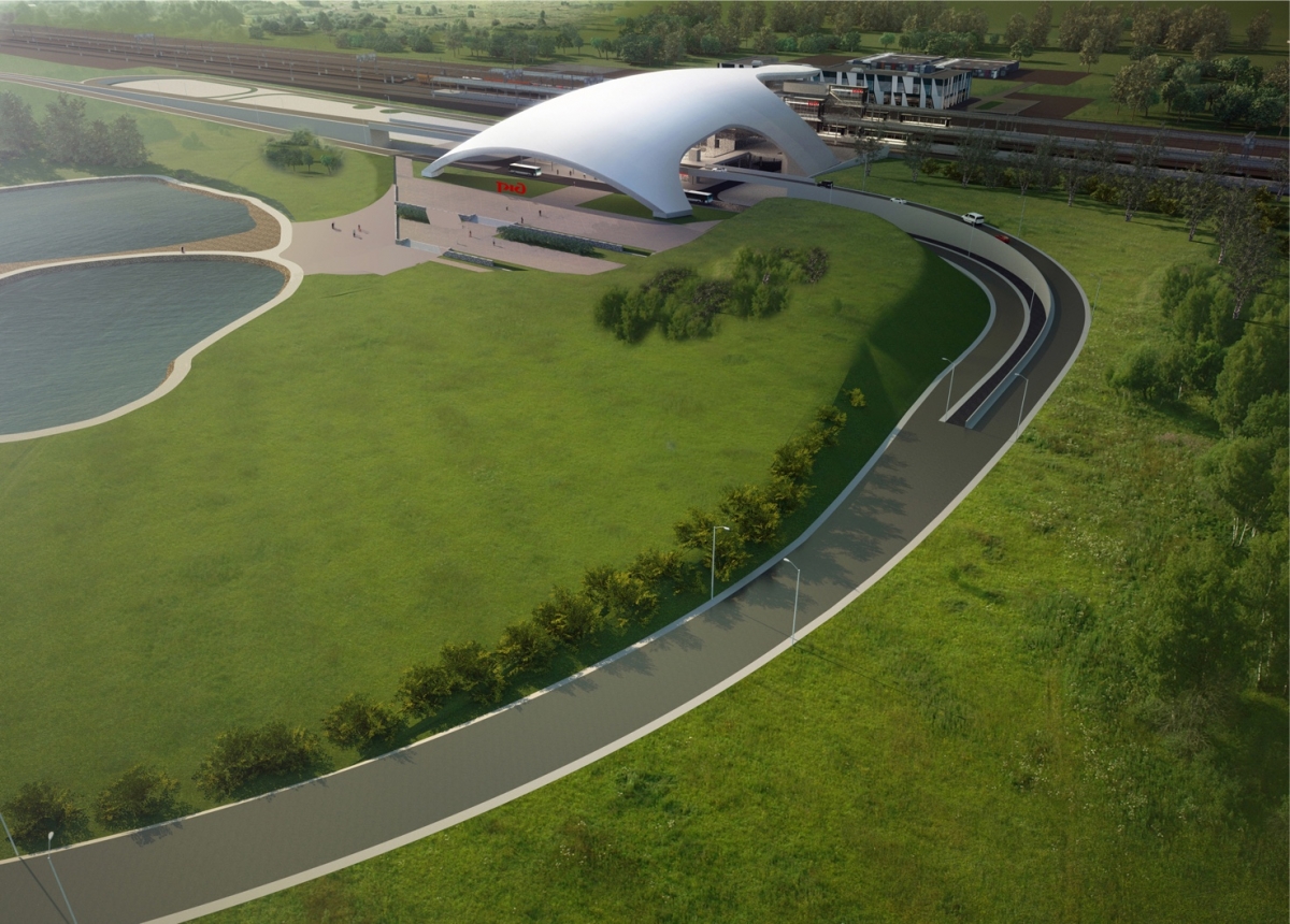Фасад будет представлять железобетонную полусферу, под которой встанет трехэтажный вокзал с остекленными стенами.