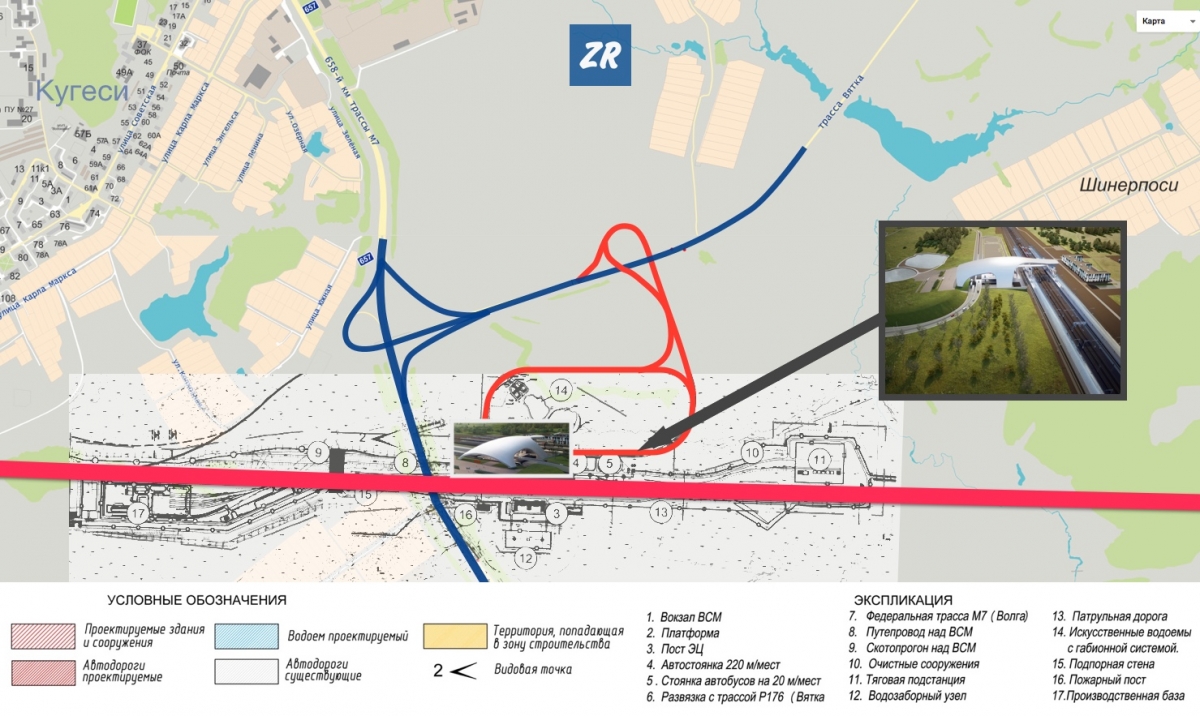 Не будем томить: по задумке авторов, вокзал расположится южнее Кугесь на трассе «Вятка» в 700 метрах от федеральной трассы М7. Здесь будут проходить сразу четыре железнодорожные ветки.