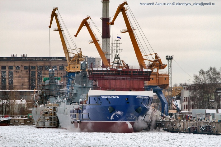 Судно тылового обеспечения «Всеволод Бобров» проекта 23120, фрегаты «Адмирал Горшков» и «Адмирал Касатонов» проекта 22350 у дострочной набережной ССЗ «Северная верфь»: