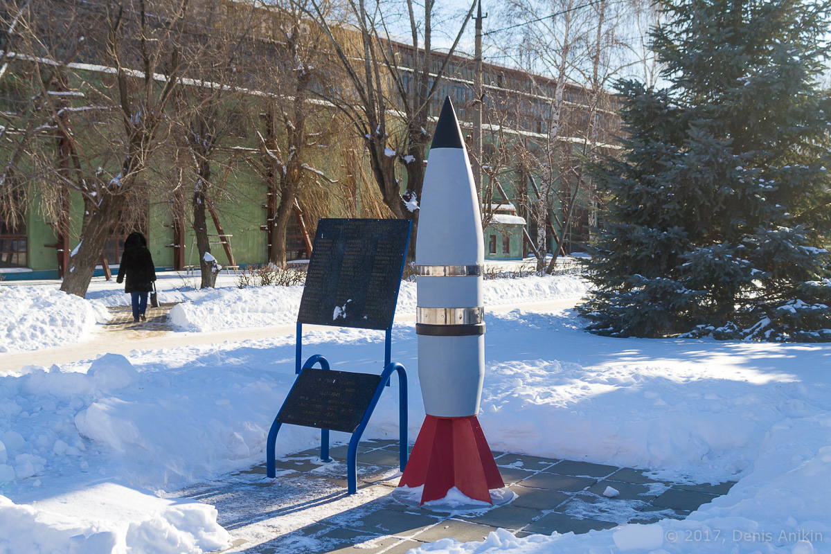 Сам завод был основан ещё в 1868 году, в селе Радица Брянского уезда Орловской области, выпускал паровозы, затем вагоны для железной дороги, а в августе 1941 года был эвакуирован в Энгельс и основной его продукцией были реактивные снаряды калибра 76,2 мм, уменьшенный макет такого снаряда и стоит за проходной