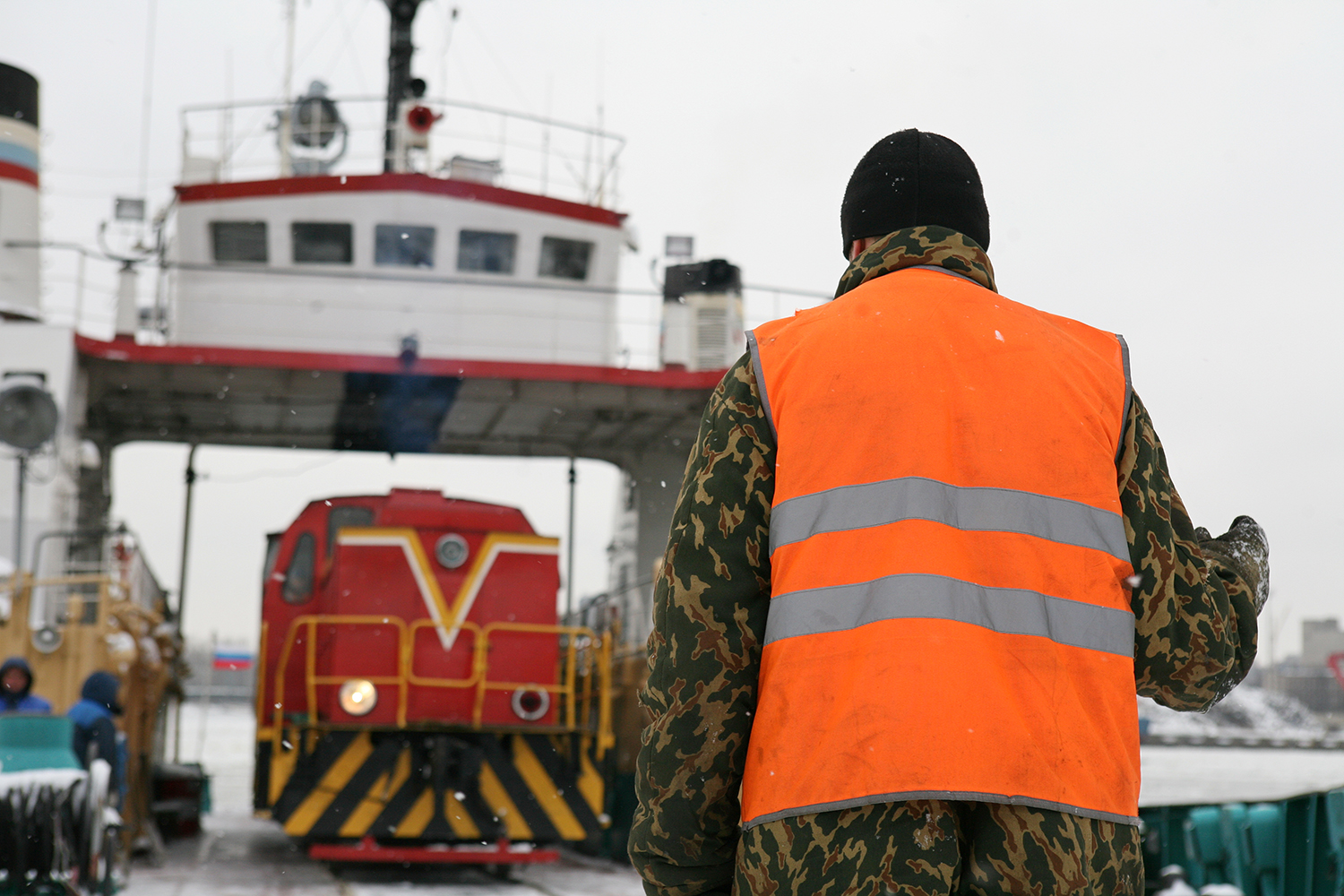 9. Выезд железнодорожного состава с парома-ледокола.