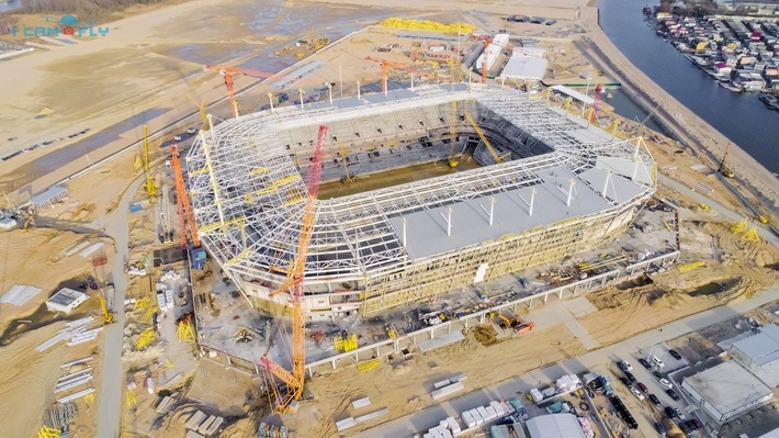 После завершения монтажа кровельных конструкций и проведения так называемого «раскружаливания» (демонтажа ИВПК), внутреннее пространство арены обрело в общих чертах тот вид, который увидят зрители матчей ЧМ-2018. Теперь строители завершат монтаж настилов трибун в опорных зонах демонтированных ИВПК, после чего приступят к устройству «пирога» футбольного поля.