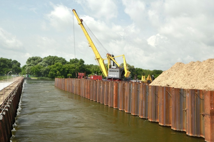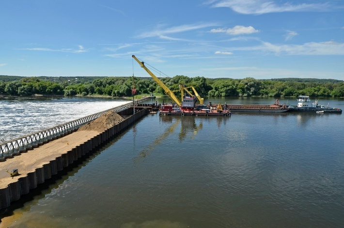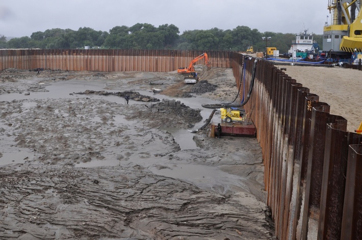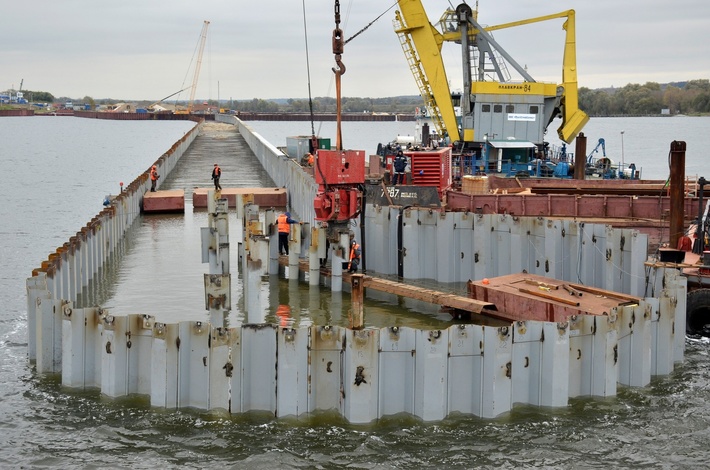 9. Началось возведение временного шпунтового ограждения места строительства плотины: