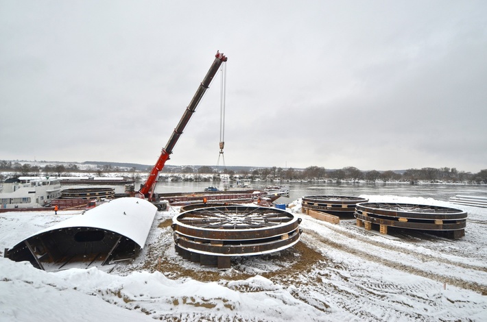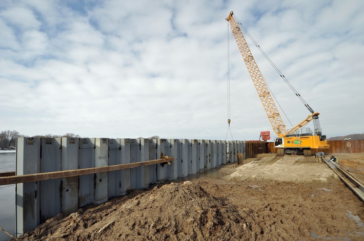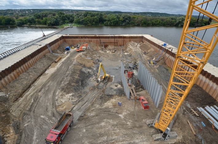 13. Выше по течению реки строят ещё одну временную шпунтовую стену — будущий котлован постепенно обретает свои очертания: