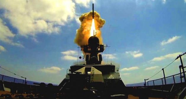 Пуск крылатой ракеты «Калибр» с малого ракетного корабля Черноморского флота из акватории Средиземного моря (Фото: снимок с видео/управление пресс-службы и информации Минобороны РФ/ТАСС)