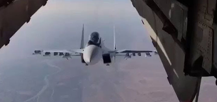 Журналист Александр Коц выложил в Сети видео, на котором видно как истребитель Су-30СМ ВКС России подлетает к тяжелому военно-транспортному самолету…