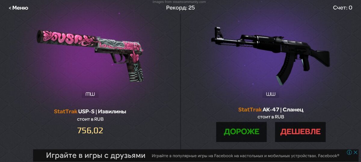Для получения первых рублей и поднятия уровня необходимо зайти в игру в которой вам нужно сравнить 2 скина, вы долны угадать дороже либо дешевле правый скин по отношению к левому. Также уровень можно поднимать открывая кейсы за рубли.